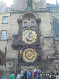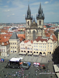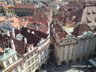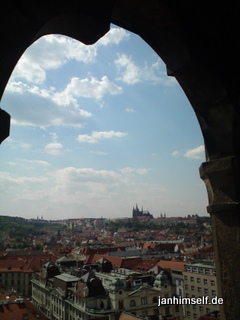 Die Touristen gucken alle auf die Uhr. Vom Turm kann man bestens über Prag blicken: